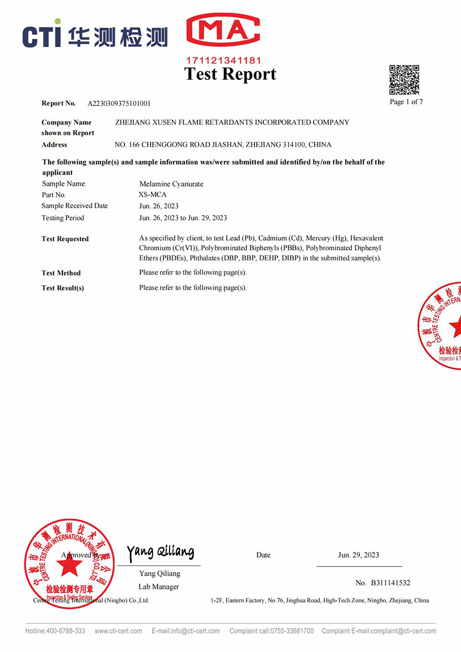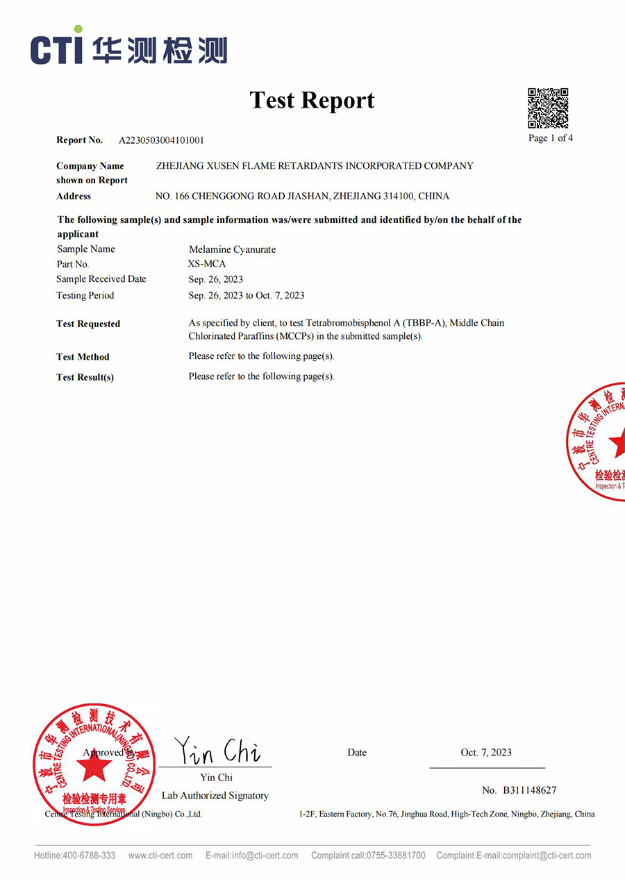 Chất chống cháy cho báo cáo thử nghiệm PA Rohs
